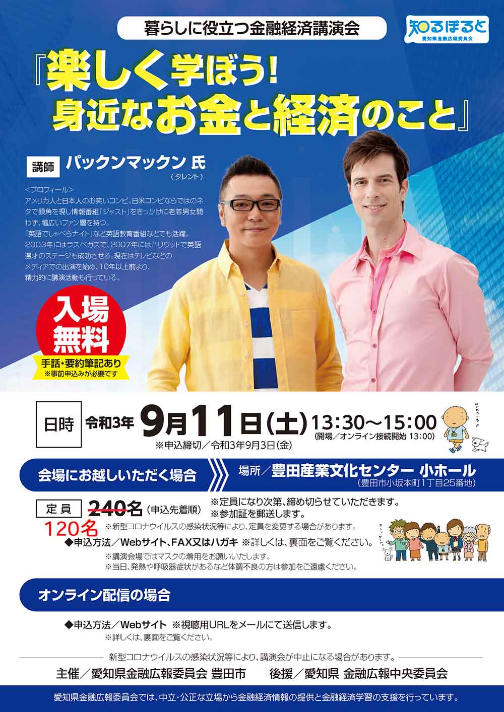 愛知県金融広報委員会と豊田市は、県民の皆様に暮らしに身近な金融経済情報を広報するため、令和3年9月11日(土)に豊田産業文化センターにて、「暮らしに役立つ金融経済講演会」を開催いたします。今年度は講師にパックンマックンをお迎えし、「楽しく学ぼう!身近なお金と経済のこと」をテーマに、楽しくお金について学んでいただきます。講演と同時にオンライン配信もいたします。是非、御応募ください。