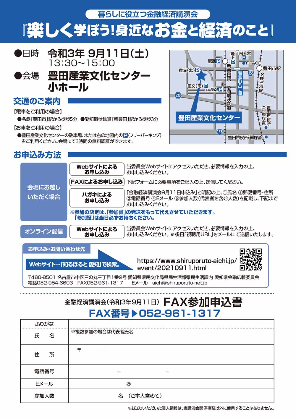 本講演会のチラシ裏面「FAX参加申込書」に必要事項をご記入のうえ、052-961-1317まで送信ください。